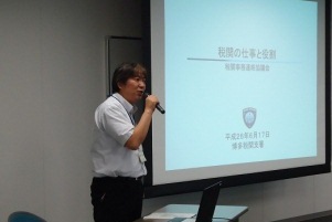 門司税関博多税関支署は、福岡港湾合同庁舎において、博多地区税関事務連絡協議会主催の研修会で総務課林田課長補佐が講演を行った。講演では、同会会員の通関業者、倉庫業者等の新人職員約110名に対し、税関の3つの使命、博多港で摘発した覚醒剤密輸入事件等について説明するとともに、不正薬物等の密輸に関する情報提供依頼を行った。