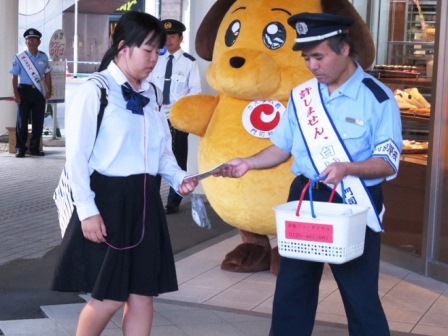 - 福岡空港税関支署は、年末特別警戒(12月6日〜15日)の出陣式に引き続き、福岡空港国際線3階出発ロビーにおいて、不正薬物等の密輸防止等を呼びかけるキャンペーンを実施した。福岡空港税関支署長の訓示や職員による決意表明等の出陣式の模様、また、税関のイメージキャラクター「カスタム君」による密輸防止のチラシを配布する模様は、当日のニュース番組でも放映され、税関の密輸取締りを広くPRした。