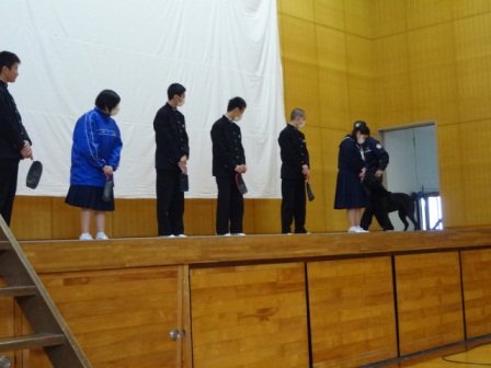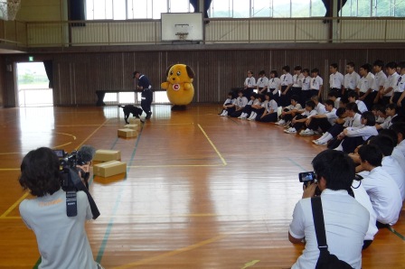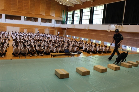 - 厳原税関支署は、対馬市立厳原中学校からの要請に基づき、全校生徒177名に対し、授業の一環として「薬物乱用防止教室」を開催した。同教室は、「薬物の種類や心身に及ぼす影響」として「危険ドラッグ」を始めとした不正薬物の種類や危険性及び門司税関管内における最近の覚醒剤等の不正薬物を摘発・押収した事例紹介、税関の業務内容の説明、麻薬探知犬によるデモンストレーションを行った。生徒たちは、普段目にすることのない麻薬探知犬のデモンストレーションを目の当たりにし、麻薬探知犬の能力の高さに歓声を上げるとともに、「押収された薬物の処分方法、麻薬探知犬の種類、カスタム君の年齢に関するものなど」積極的な質問があり、日頃馴染みの薄い「税関」という仕事に対する興味も大いに沸いたようであった。