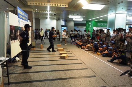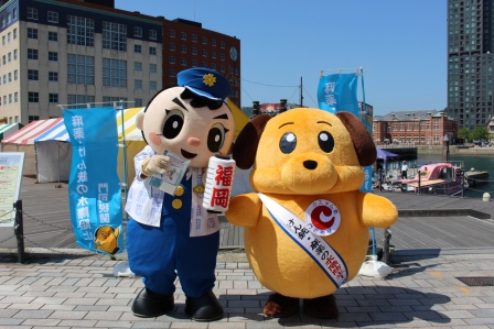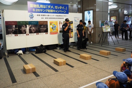 - 門司税関は、福岡県が主催する「ダメ・ゼッタイヤング街頭キャンペーン」において、麻薬探知犬のデモンストレーションによる薬物乱用防止を呼びかけた。この活動は「国際麻薬乱用撲滅デー」に併せて開催されたもので、小学生の代表2名による決意表明に引き続き、監視部麻薬探知犬管理室が麻薬探知犬のデモンストレーションを披露した。「パズー号」がみごとにダミーの入った箱を発見すると、見学者から歓声がわき、「麻薬探知犬は何歳まで働くのか」等の質問が寄せられるなど、今回のデモンストレーションを通じて、不正薬物乱用の恐ろしさはもとより、税関の存在や水際取締りについても理解していただく良い機会となった。