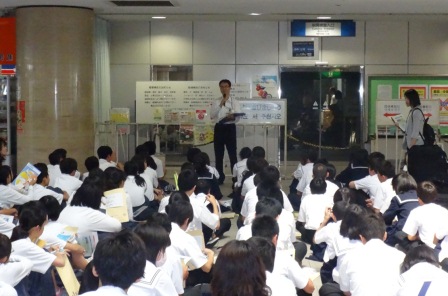- 門司税関下関税関支署は、一般社団法人日本中小型造船工業会主催の「ものづくり体験講座」に参加した下関市立文洋中学校2年生(53名)及び夢が丘中学校1年生(88名)の見学を午前と午後の2回に分けて下関港国際ターミナルで受け入れ、税関の仕事と役割、最近の密輸摘発事例等について説明を行った。今回の見学を通じて、税関の職場を初めて知った生徒も多く、地元の中学生に税関の存在やその役割を理解していただくよい機会となった。