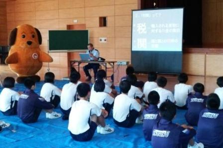 - 門司税関徳山税関支署は、光市立大和中学校(光市)において、3年生生徒等(約60名)を対象とした税関教室を開催し、その模様を報道機関に公開した(テレビ2社、新聞1社の取材)。税関教室では、原田同支署光出張所長から、不正薬物の恐ろしさやそれを水際で取り締まる税関の役割及び危険ドラッグの危険性について説明するとともに、麻薬探知犬によるデモンストレーションを行った。生徒たちは、麻薬探知犬の能力の高さに驚きの声を上げるとともに、不正薬物の恐ろしさや税関における不正薬物の取締りに理解を深めた。また、税関イメージキャラクターの「カスタム君」が登場すると大きな歓声があがり、笑顔あふれる税関教室となった。税関教室の模様はテレビ等で報道された。