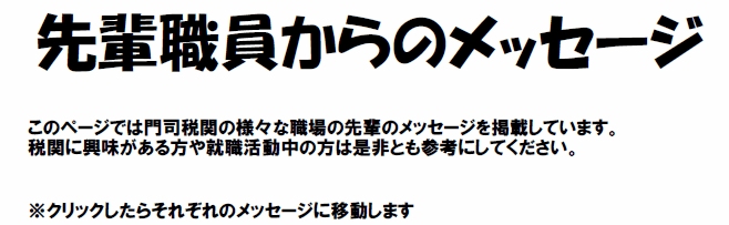 就活中の方や公務員志望の方へ向けた、先輩若手職員からのメッセージを掲載しています。是非ご覧ください!海港取締R3採用(大卒・行政)旅具検査R2採用(大卒・機械)審理H28採用(高卒・技術)麻薬探知犬(ハンドラー)H31採用(大卒・行政)輸出入通関H30採用(大卒・電気/電子/情報)知的財産H28採用(高卒・事務)事後調査H29採用(大卒・行政)システム管理H29採用(高卒・技術)分析R2採用(大卒・化学)