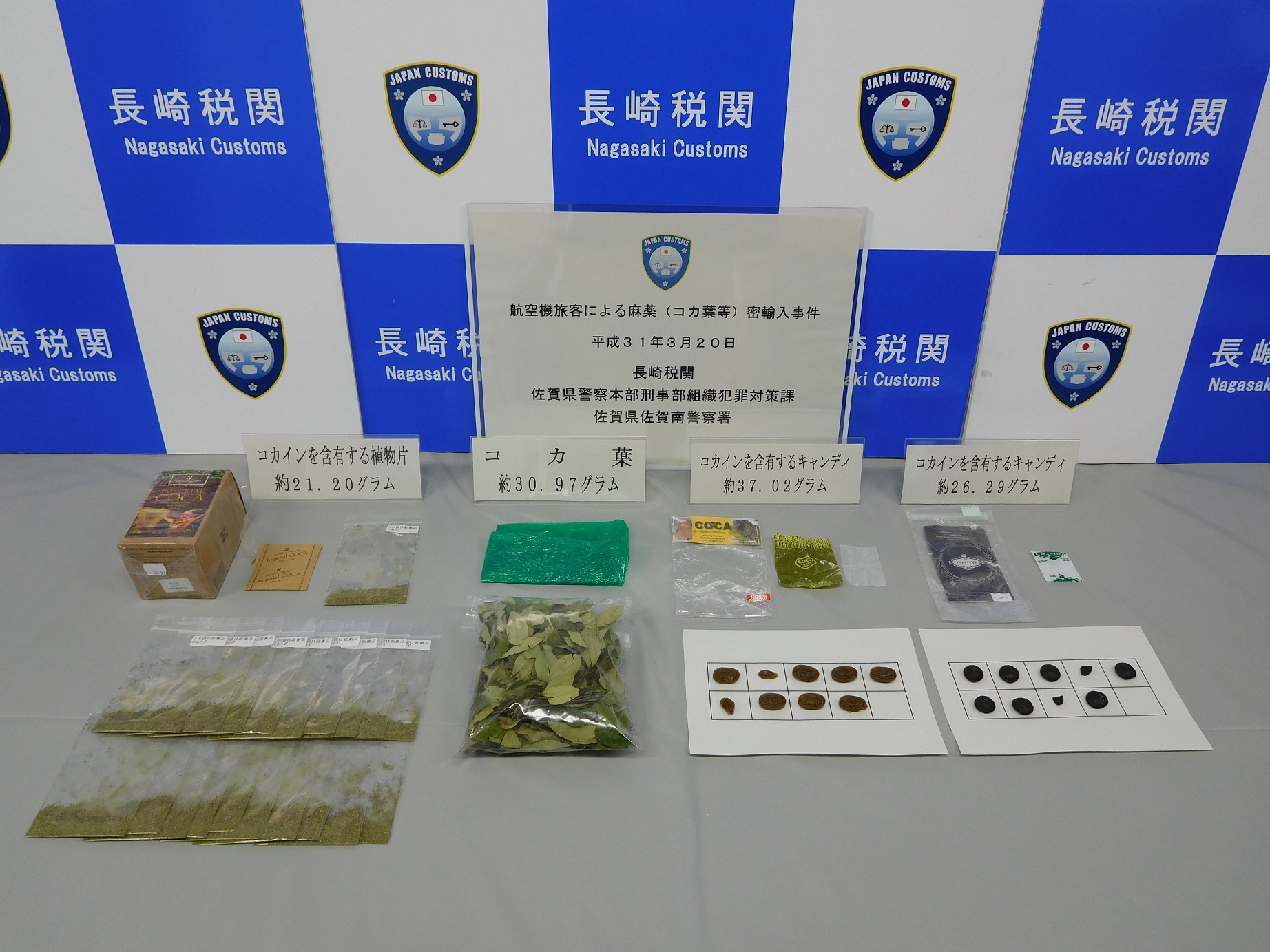 長崎税関は、平成31年3月4日、中華人民共和国から帰国した日本人男性旅客による麻薬(コカ葉他)密輸入事件について、佐賀県警察本部及び佐賀南警察署と共同調査を実施し、平成31年3月20日、関税法違反で佐賀地方検察庁に告発しました。【犯則物件】