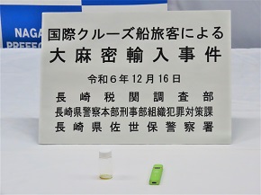 犯則嫌疑者は、大韓民国から本邦に大麻を輸入することを企て、国際クルーズ船に旅客として乗船し、関税法上の輸入してはならない貨物である上記の犯則物件を輸入しようとしたが、令和6年11月17日、長崎税関佐世保税関支署職員による手荷物検査において発見され、その目的を遂げなかったものである。
