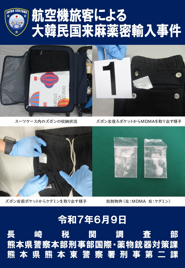 犯則嫌疑者は、大韓民国から本邦に麻薬を輸入することを企て、関税法上の輸入してはならない貨物である上記犯則物件を携帯品内に隠匿の上、輸入しようとしたが、令和7年5月22日、長崎税関八代税関支署熊本空港出張所における入国旅具検査において同出張所職員に発見され、その目的を遂げなかったものである。