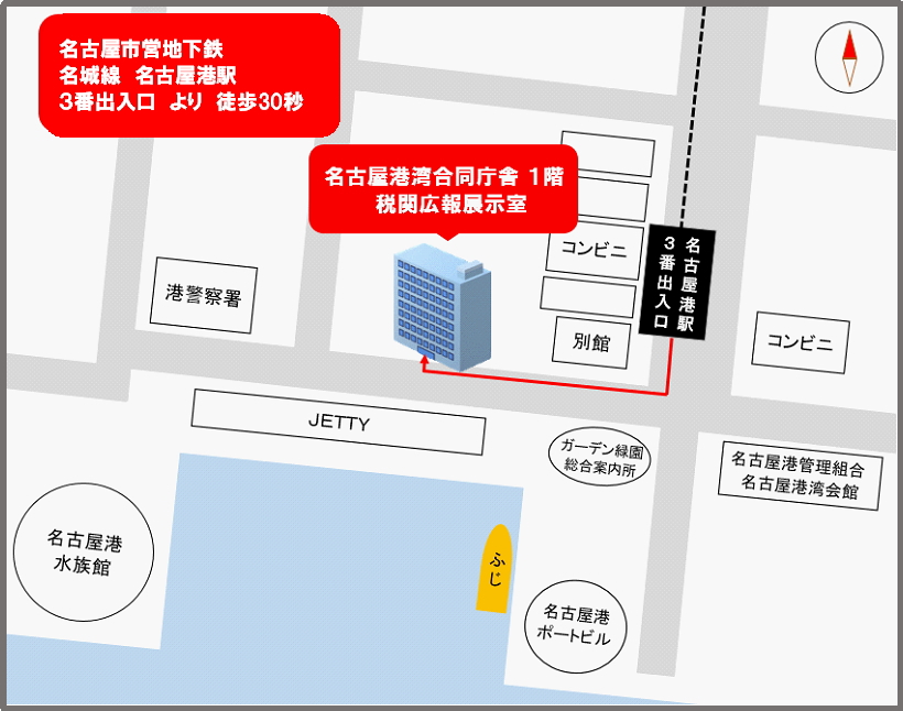 | 所在地 | 名古屋市港区入船2−3−12 名古屋港湾合同庁舎1階 ※見学の方のための駐車場はございません。 お車でお越しの方は、お近くの有料駐車場をご利用ください。 |