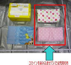 上記第1の事実を調査していたところ、同じ名宛先にブラジルから到着した国際小包1個が郵便局内で保管されていることを突き止め、本年4月26日、同国際小包を税関で差押え、検査したところ、幼児用毛布2枚に染み込ませて隠匿されたコカインを発見した。同幼児用毛布2枚を検査、鑑定したところ、コカイン714.05グラムを摘発した。