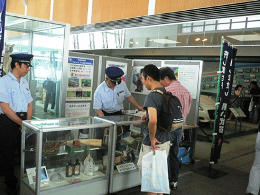 名古屋税関清水税関支署静岡空港出張所は、年末特別警戒期間(12月8日〜17日)に併せて、富士山静岡空港出国検査場内で不正薬物・銃器等密輸撲滅キャンペーンを実施し、国外へ出発する旅客に対してリーフレットの配布を行うとともに密輸撲滅及び密輸情報の提供を呼び掛けた。