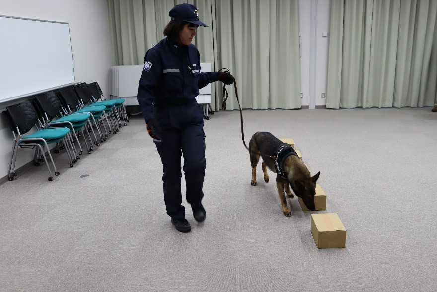 名古屋税関中部空港税関支署は、愛知保護区保護司会長久手部会・長久手市更生保護女性会の見学を受け入れ、税関業務についての説明した他、展示物品の解説を通じ、不正薬物の密輸手口、知的財産侵害物品等についての説明を行いました。また、麻薬探知犬のデモンストレーションも行いました。