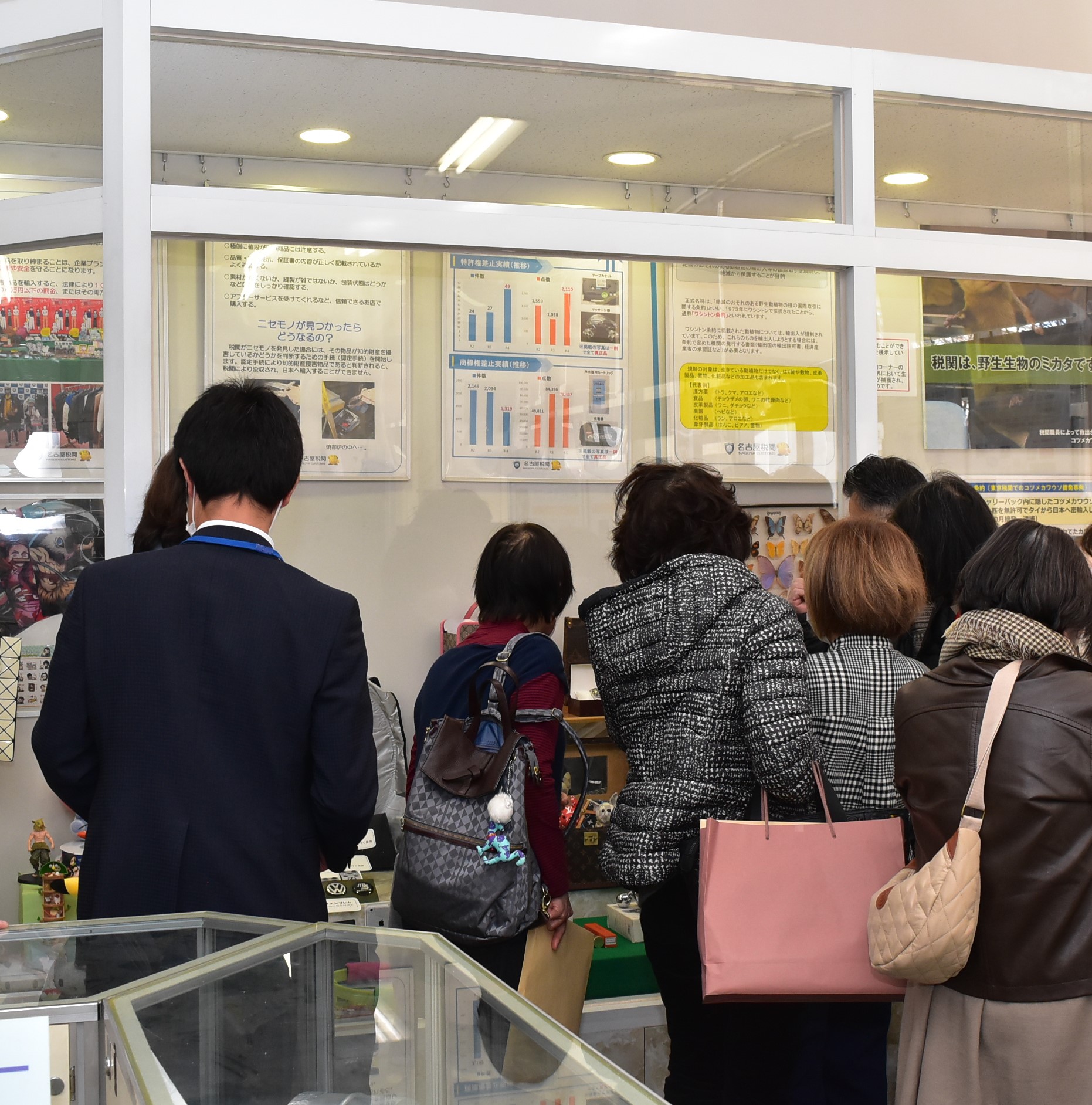 名古屋税関諏訪出張所は、MIDORI松本店において税関展を開催し、税関業務を紹介したパネルや隠匿手口の展示などを通して、税関の使命や役割について紹介し、来場された方に税関業務に対する理解を深めていただきました。子供向けの折り紙・ぬりえコーナーや制服着用体験、金属探知機や金の重さ体験、知的財産侵害物品の本物ニセモノクイズなどを行い、会場は大いに賑わいました。
