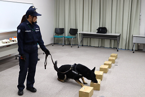 名古屋税関中部空港税関支署は、津島少年補導委員会を受け入れ、税関業務についての説明をした他、展示物の解説を通じ、不正薬物の密輸手口、知的財産侵害物品等についての説明を行いました。また、麻薬探知犬のデモンストレーションも行いました。