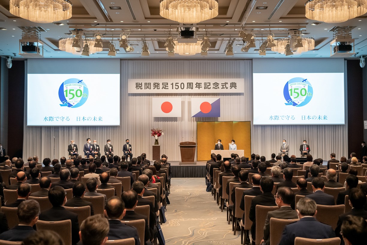 令和4年11月28日(月)、税関が明治5(1872)年に発足してから150周年を迎えるにあたり、パレスホテル東京(東京都千代田区)において、税関発足150周年記念式典を挙行しました。式典には、秋篠宮皇嗣同妃両殿下の御臨席を賜り、また、多くのご来賓の方々にご列席頂きました。