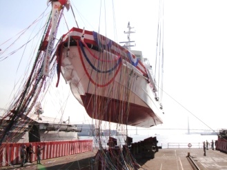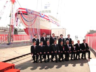 監視艇「しまかぜ」命名・進水式本年3月末に完成予定新監視艇の命名・進水式が、1月11日にユニバーサル造船株式会社京浜事業所(神奈川県横浜市)において、菅原税関長をはじめ、関係者が出席し執り行われた。当日は天候にも恵まれ、命名・進水式にふさわしい晴れやかな日差しの中、菅原税関長による力強い「しまかぜ」の命名、及び支綱の断綱が行われ、出席者が見守る中、新監視艇は無事海面に着水となった。 | |