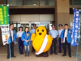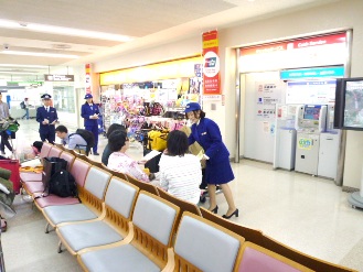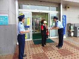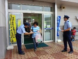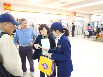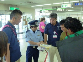 平良出張所が街頭キャンペーン実施平良出張所は、「薬物および銃器取締強化期間」に伴い、宮古島市内のショッピングセンターにおいて街頭キャンペーンを実施した。一般の通行人に対しチラシを配布し、密輸情報の提供について協力を呼びかけた。 | |