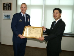米空軍第18憲兵中隊司令官へ感謝状贈呈米空軍第18憲兵中隊司令官G.ジョン グリム氏が4月末に離任するにあたり、同氏の在任中における税関業務への功績に対して、菅原元信沖縄地区税関長から同氏に対する感謝状の贈呈が行われました。 | |