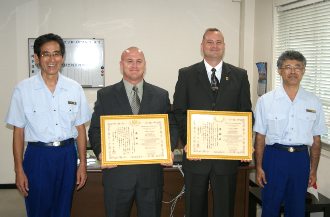 在沖米海兵隊憲兵隊犯罪捜査部捜査隊長に対する感謝状贈呈在沖米海兵隊憲兵隊犯罪捜査部捜査隊長ジェフリーS.ロドリゲス氏及び同犯罪捜査部主任捜査官ブライアンN.キャスルベリー氏の離任にあたり、両氏の在任中における税関業務への功績に対し、林沖縄税関支署長から感謝状の贈呈が行われました。 |