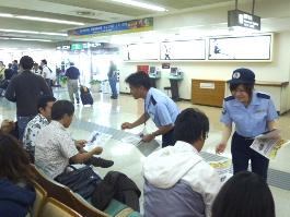 那覇空港国際線旅客ターミナルロビーにおいてキャンペーン実施那覇空港税関支署は「薬物及び銃器取締強化期間」に伴い、那覇空港国際線旅客ターミナルロビーにおいて、出発及び到着旅客に対し密輸情報提供依頼のチラシを配布し密輸撲滅キャンペーンを実施した。 | |