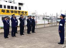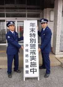 年末特別警戒出陣式を実施沖縄地区税関は、年末における海外からの旅客及び貨物の増大に伴い、これに便乗した密輸事犯に的確に対処するため、12月10日(月)から19日(水)まで年末特別警戒を実施する。初日の12月10日(月)に那覇空港税関支署において出陣式を実施した。また、石垣税関支署及び平良出張所においても出陣式や看板設置式が行われるなど、これらの模様について報道機関に公開した。 | |