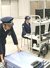 空港(くうこう)での税関(ぜいかん)の仕事(しごと)は、麻薬探知犬(まやくたんちけん)やエックス線検査装置(せんけんさそうち)を使って、日本に麻薬(まやく)やけん銃(じゅう)が入ってくるのを防(ふせ)いでいます。輸出入(ゆしゅつにゅう)される品物(しなもの)のチェックもしています。
