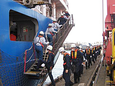空港と同じく、正しく貿易(ぼうえき)が行われるように、港(みなと)で外国と日本を行き来する船や、運(はこ)んでいる品物のチェックをしています。