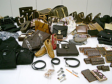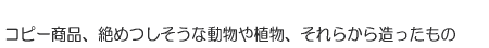 バッグやお財布(さいふ)など、有名(ゆうめい)なブランドの名前、マーク、デザインなどを勝手(かって)に使(つか)って、本物(ほんもの)に似(に)せて作ったコピー商品(しょうひん)。絶滅(ぜつめつ)しそうな動物(どうぶつ)や植物(しょくぶつ)を守(まも)るために国際的(こくさいてき)な売り買いが禁止(きんし)された動物や植物(ワシントン条約該当物品(じょうやくがいとうぶっぴん)といいます。)は日本に持ち込めません。隠(かく)して持ち込もうとすると密輸入(みつゆにゅう)となり法律(ほうりつ)で罰(ばっ)せられます。