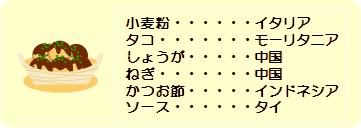 たこ焼(や)きも実(じつ)はほとんどの材料(ざいりょう)が外国(がいこく)からの輸入品(ゆにゅうひん)からできています。