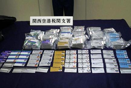 大阪税関関西空港税関支署は、平成19年7月17日、中国から関西国際空港に到着したシンガポール人男性がスーツケースに隠匿し密輸入しようとした偽造クレジットカードの原板1,512枚を摘発し、同年8月6日、関税法違反容疑で大阪地方検察庁堺支部に告発した。