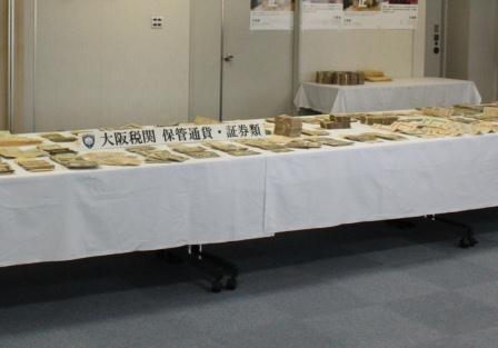 大阪税関は、8月5日(月曜日)、大阪税関監視部庁舎(大阪市港区)において、終戦後、海外から引き揚げてこられた方々からお預かりし、税関において保管している通貨及び証券類の虫干しの様子を報道機関に対し公開した。一日でも早くご本人やご家族の方々の手元に保管証券類が返還されることを期待している。(8月5日 報道発表)