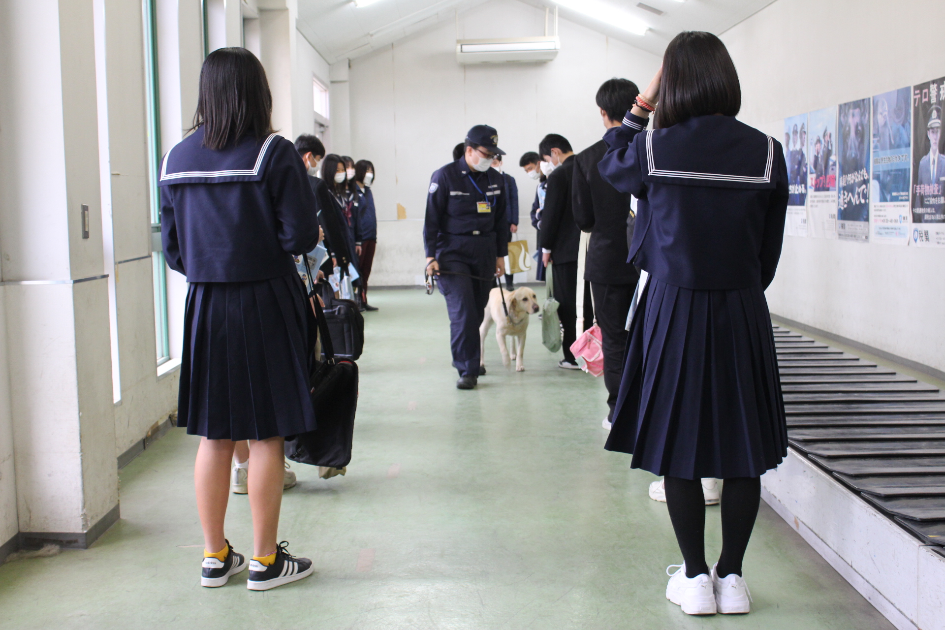 関西空港税関支署は、3月17日(金)、泉南市立西信達中学校の生徒向けに職業体験学習を実施した。取締業務である制限区域内の巡回や旅具検査業務で使用する検査機器、麻薬探知犬のデモンストレーションを見学した。