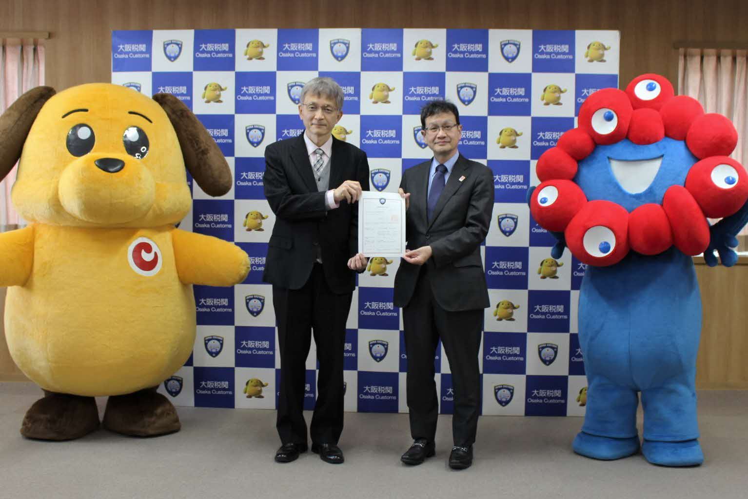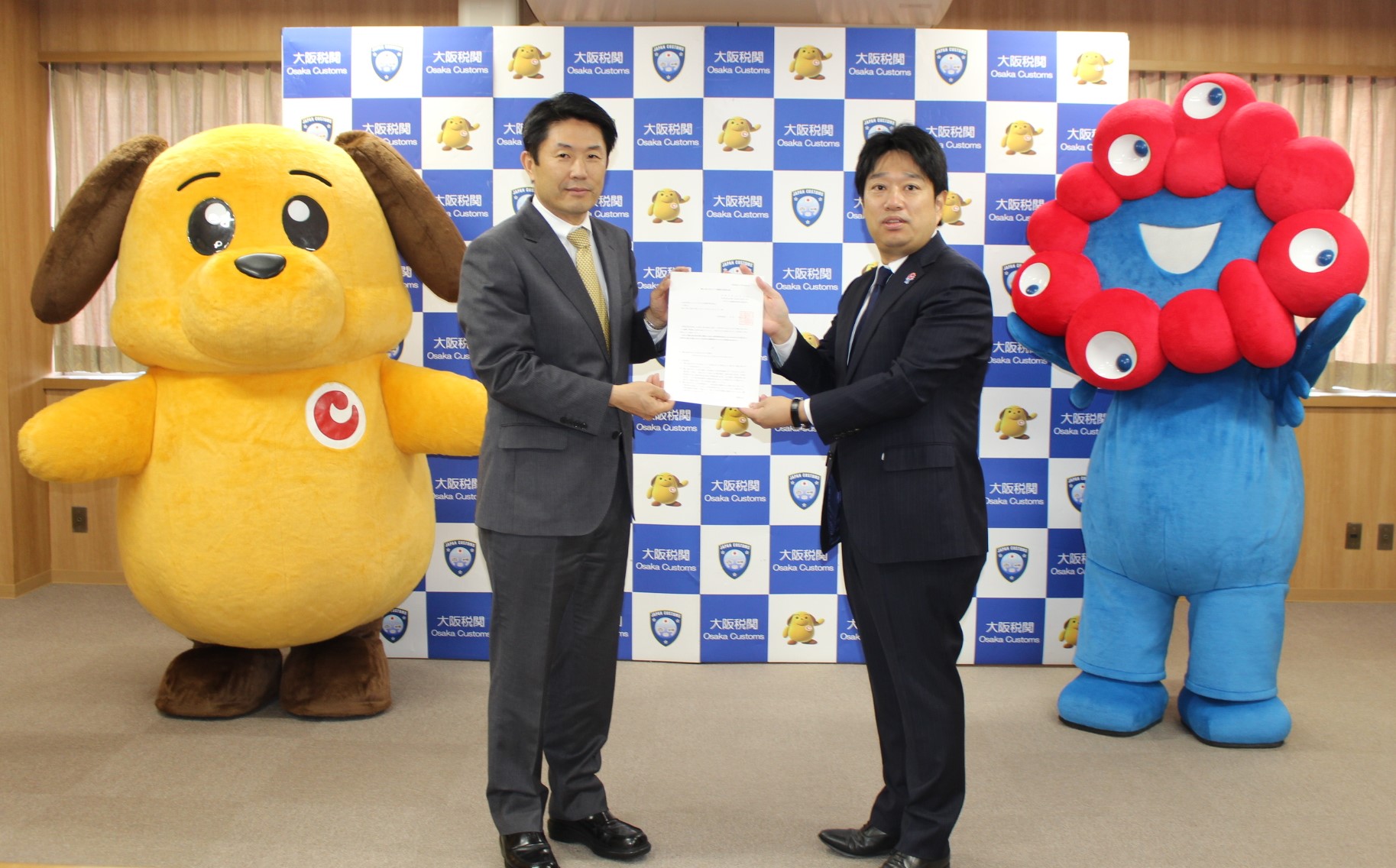 大阪税関は、「公益社団法人2025年日本国際博覧会協会」が有する商標権(大阪・関西万博公式キャラクター「ミャクミャク」等)にかかる輸入差止申し立てを受理し、2023年(令和5年)11月1日(水曜日)大内 聡 大阪税関長から、 輸入差止申立て受理通知書を公益社団法人2025年日本国際博覧会協会広報・プロモーション局局長小林 浩史(こばやしこうじ)氏に対して交付した。