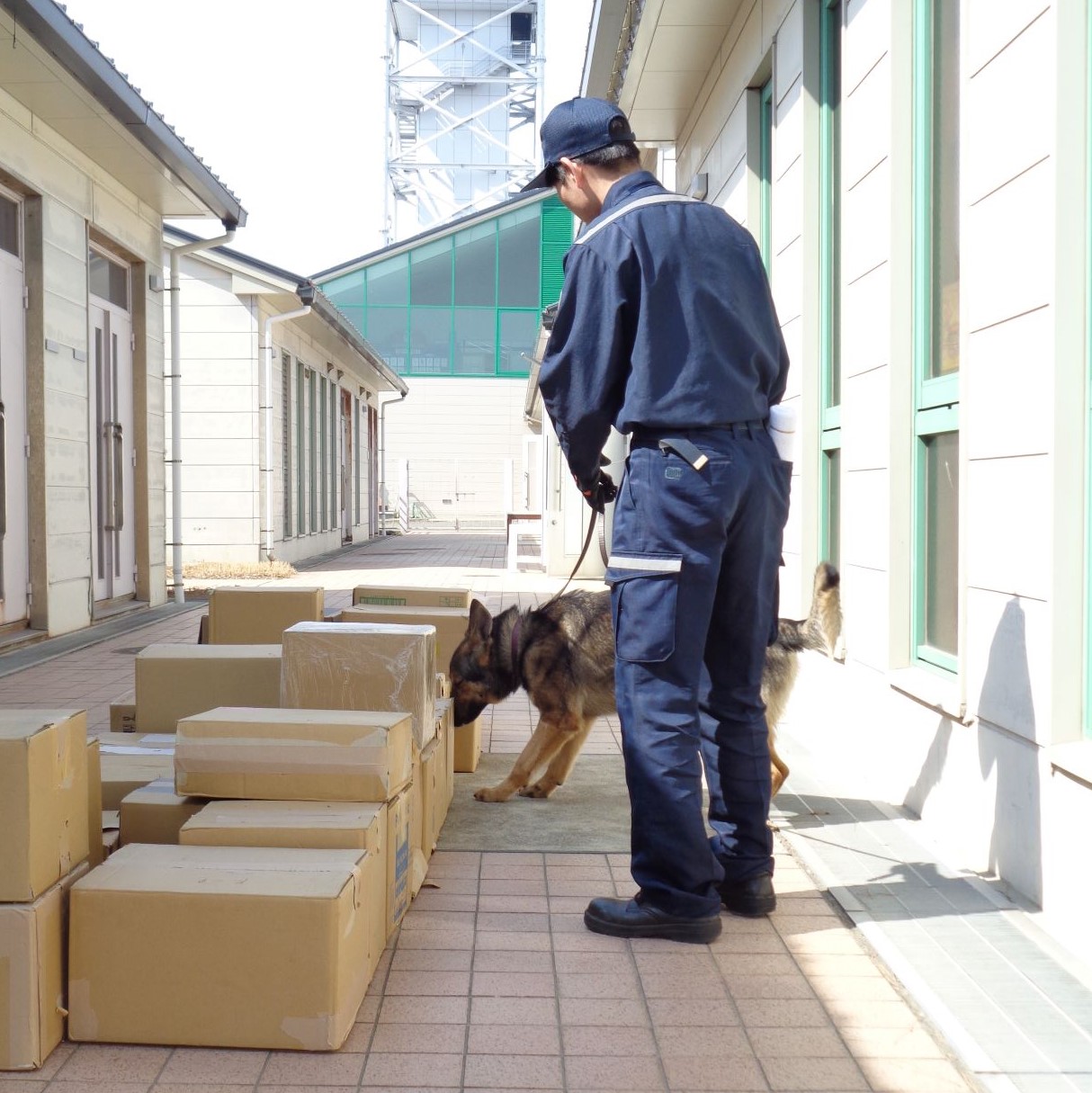 私は現在、関西空港にある麻薬探知犬管理室で麻薬探知犬「クマゴロウ号」のハンドラーとして勤務しています。大麻や覚醒剤などの不正薬物の密輸を防ぐため、入国する旅客の手荷物や輸入貨物、郵便物を検査することが主な仕事です。また、自分が担当する麻薬探知犬の健康管理や、能力向上を目的とした訓練もハンドラーの仕事です。動物と一緒に仕事ができる数少ない職場ですが、意思を持った動物と仕事をするため、なかなか思い通りにならないこともあります。
