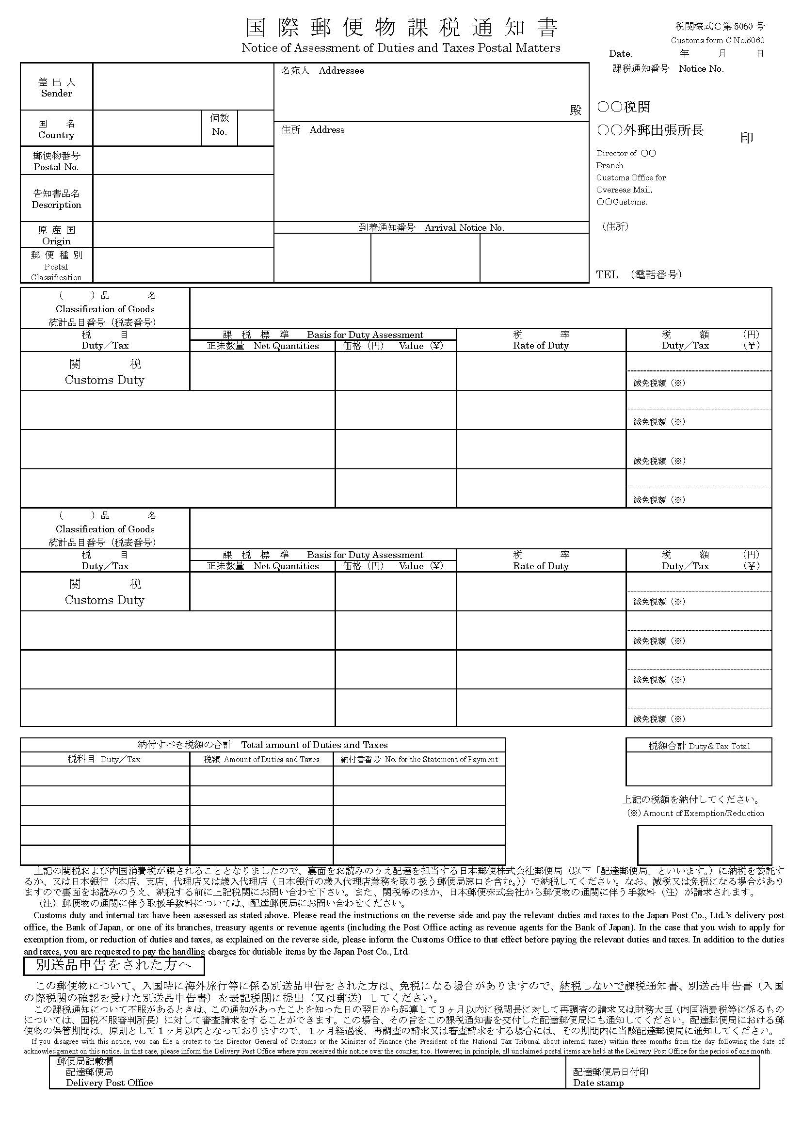 6103 「国際郵便物課税通知書」の見方、手続(カスタムスアンサー)