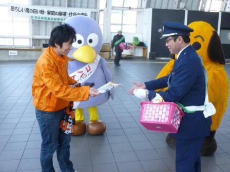 新潟税関支署は、東京通関業会新潟通関協議会主催の密輸撲滅キャンペーンに参加した。朝のJR新潟駅前で通勤・通学する方々にキャンペーングッズを配布し、密輸撲滅に向けた情報提供等を呼び掛けるとともに、薬物及び銃器取締強化期間に併せ、税関における密輸取締りへの取組みをアピールした。