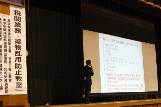 東京税関は三郷市立瑞穂中学校において、全校生徒約250名を対象に税関教室を開催した。税関の業務と役割、麻薬等の不正薬物や危険ドラッグの怖さについて説明したほか、麻薬探知犬(ヒルト号、ウッツ号)によるデモンストレーションを行い、薬物乱用防止のための啓蒙活動を実施した。