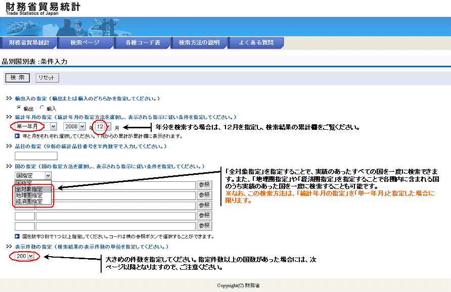 貿易統計(検索ページ)の「国別品別表」を選択、9桁の統計品目番号を半角で入力します。なお、統計年月の指定を「単一年月」以外の複数年や四半期などにできますが、その場合、一つの統計品目番号しか入力できません。(検索結果として表示された表の一部又は全部を範囲指定のうえ、コピーすることで表計算ソフトなどに貼り付けて加工することができます。)