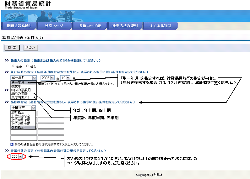 貿易統計(検索ページ)の「統計品別表」を選択、9桁の統計品目番号を半角で入力します。なお、統計年月の指定を「単一年月」以外の複数年や四半期などにできますが、その場合、一つの統計品目番号しか入力できません。(検索結果として表示された表の一部又は全部を範囲指定のうえ、コピーすることで表計算ソフトなどに貼り付けて加工することができます。)
