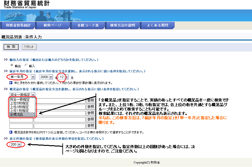 貿易統計(検索ページ)の「概況品別表」を選択、概況品を選択します。選択の際、統計年月の指定を「単一年月」で指定した場合、「全概況品」を指定することにより、一つの概況品だけでなく、実績のあった全ての概況品をまとめて検索できます。また、上位1桁、3桁、5桁指定では各上位桁を共通とする概況品をまとめて検索することも可能です。逆に、一つの概況品のみを検索する場合は、複数年や四半期などの指定ができます。(検索結果として表示された表の一部又は全部を範囲指定のうえ、コピーすることで表計算ソフトなどに貼り付けて加工することができます。)