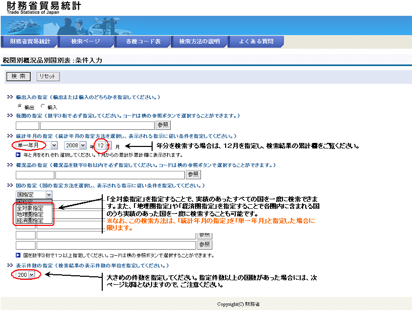 貿易統計(検索ページ)の「税関別概況品別国別表」を選択、税関(港)、年月、概況品を指定、国の指定を「全対象指定」とすると輸出先(仕向国)及び輸入元(原産国)をまとめて検索できます。また、年分を検索する場合は、12月を指定し、累計欄をご覧ください。