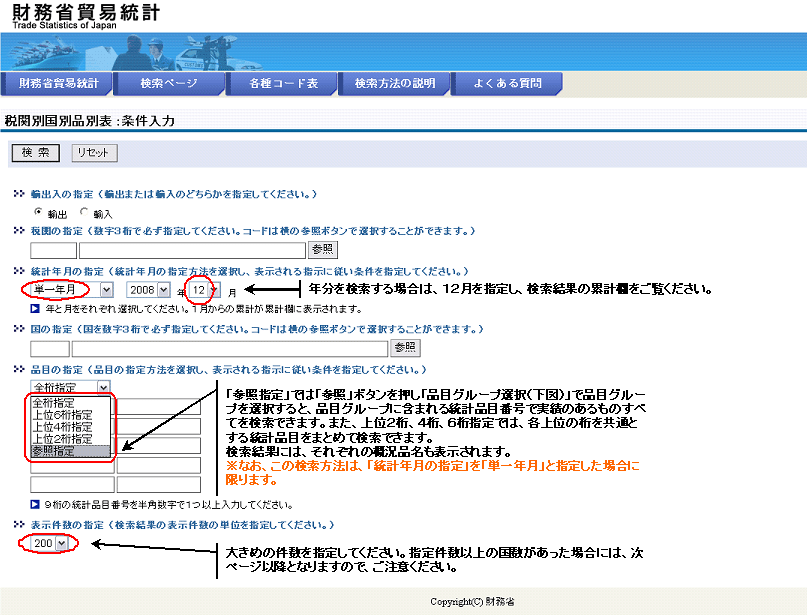 貿易統計(検索ページ)の「税関別国別品別表」を選択、税関(港)、国を選択します。選択の際、統計年月の指定を「単一年月」で指定した場合、統計品目番号の一部(「上位2桁(類)」、「上位4桁(項)」、「上位6桁(号)」)での入力が可能になります。検索結果として、該当する9桁の統計品目番号で実績のあるものが全て表示されます。 また、「参照指定」を指定し、右にある「参照」ボタンを押しますと、品目グループ選択ウィンドが開き、品目グループを選択することで品目グループに含まれる9桁の統計品目番号で実績のあるものが全て表示されます。なお、年分を検索する場合は、12月を指定し、累計欄をご覧ください。