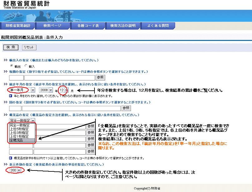 貿易統計(検索ページ)の「税関別国別概況品別表」を選択、税関(港)、国を指定します。選択の際、統計年月の指定を「単一年月」で指定した場合、「全概況品」を指定することにより、一つの概況品だけでなく、実績のあった全ての概況品をまとめて検索できます。また、上位1桁、3桁、5桁指定では各上位桁を共通とする概況品をまとめて検索することも可能です。逆に、一つの概況品のみを検索する場合は、複数年や四半期などの指定ができます。(検索結果として表示された表の一部又は全部を範囲指定のうえ、コピーすることで表計算ソフトなどに貼り付けて加工することができます。)