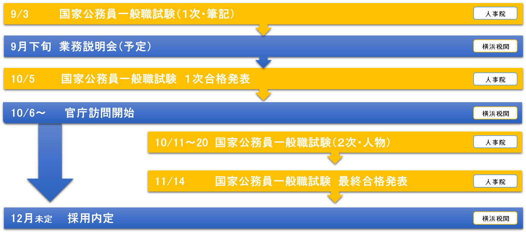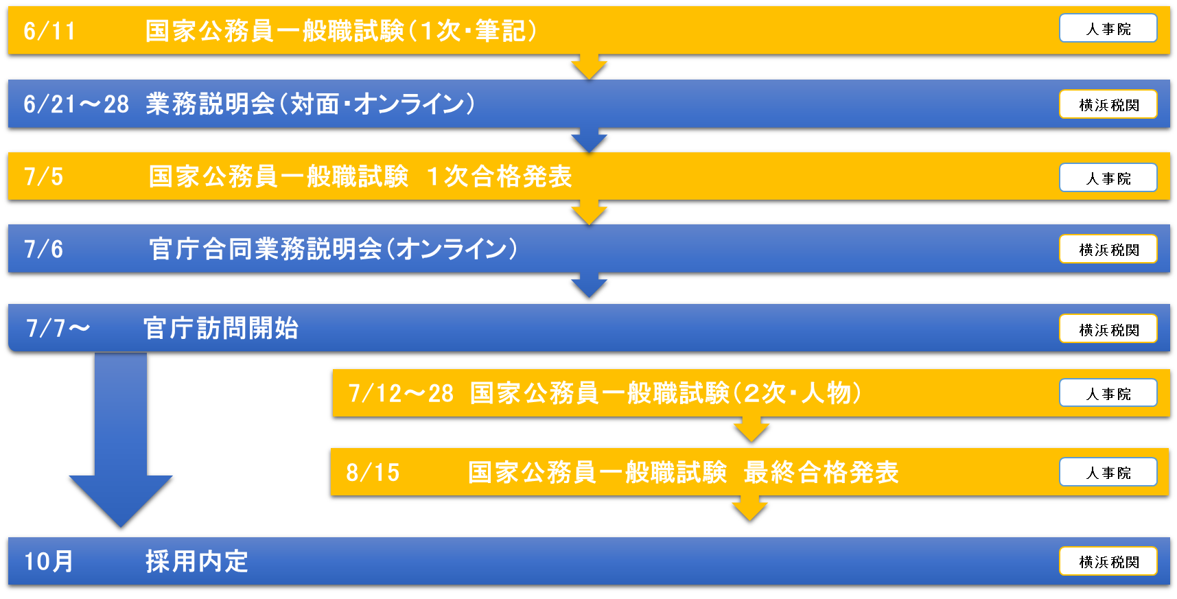 横浜税関におきましても、国家公務員一般職試験の日程にあわせて業務説明会、官庁訪問等を行っており、日程等の詳細を随時掲載しております。