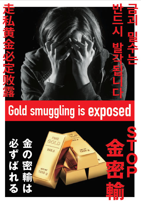 | STOP!金密輸!!金の密輸は重大な犯罪です。 | 海外旅行者向けに「運び屋」とならないよう注意喚起するためのリーフレットです。 | 一般の方向けに疑わしい事例をイラスト化したリーフレットです。 |
